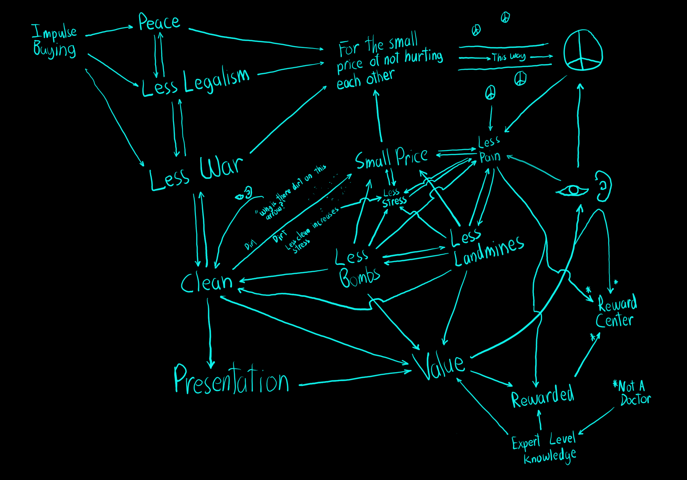 Motion, Anger Management, Fries, Chain Thoughts, Harder to divest, Flags, Capitalism, Associations, Logical Fallacies, Anxiety, Frame of Reference, Pressure, Reducing Antisemitism, Quantum Entanglement, Thermodynamics, Unknowns upsold to Knowns, Nonviolence, Coffee, Pineapples, Impedance, Value Creation, Questions, Propaganda, Space Travel, Equal and Opposite Forces